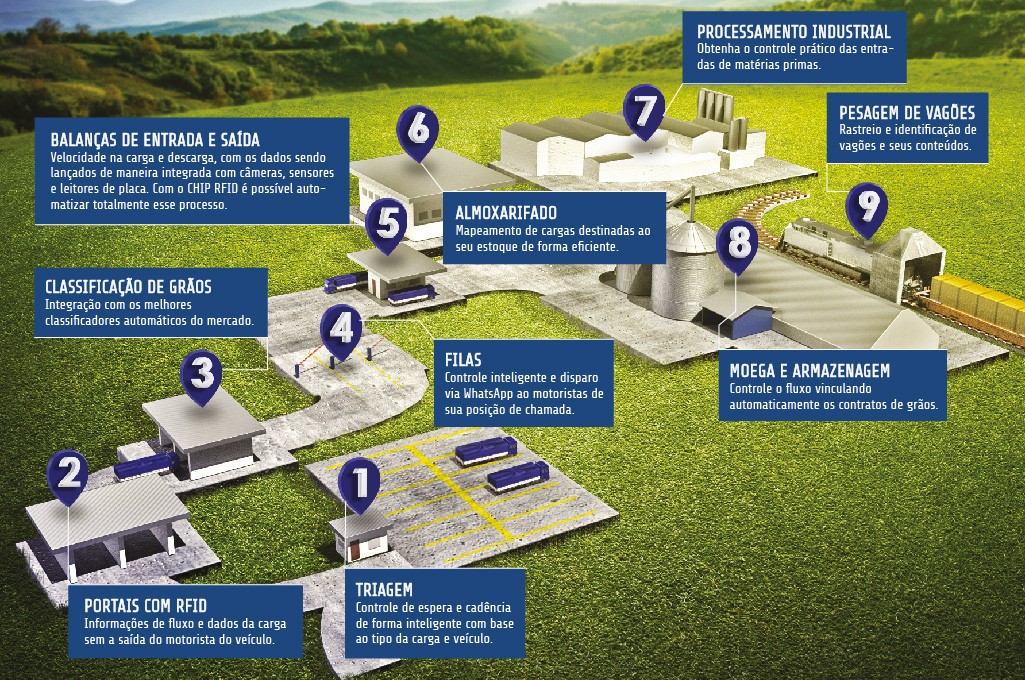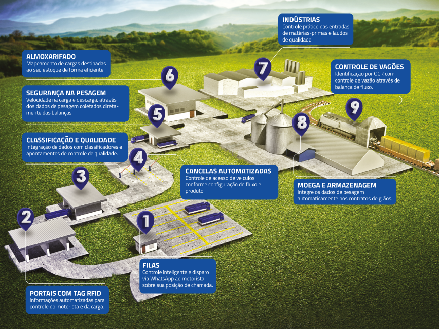 - Atende a fluxos simples, como somente digitação da placa e confirmação de pesagem manual até total automação de rotas e orientação dentro do pátio via semáforos e identificadores de veículo (RFID, OCR) conforme lista de equipamentos homologados;